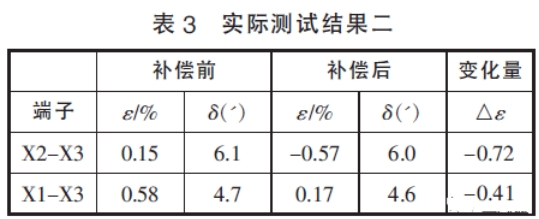 在表2和表3的實(shí)測(cè)效果中,補(bǔ)償前后相位差改動(dòng)不大,標(biāo)明本文中筆者舉薦的輔佐電壓互感器規(guī)劃結(jié)構(gòu)漏抗小,對(duì)相位差的影響可以忽略不計(jì),與剖析效果一起。